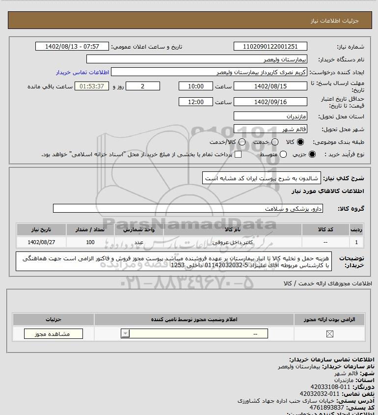 | 1 | -- | کاتتر داخل عروقی | عدد | 100 | 1402/08/27 |
