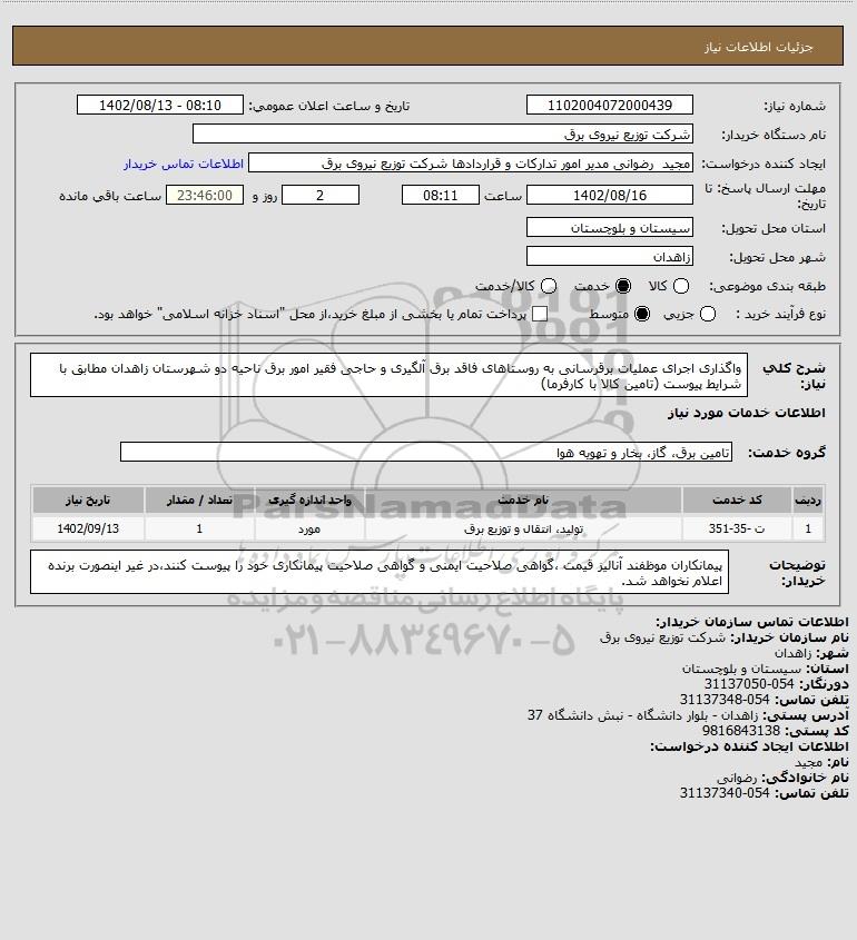 شرح کلی نیاز: واگذاری اجرای عملیات برقرسانی به روستاهای فاقد برق آلگیری و حاجی فقیر امور برق ناحیه دو شهرستان زاهدان مطابق با شرایط پیوست (تامین کالا با کارفرما)