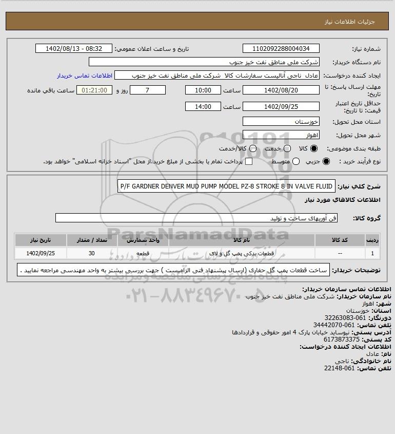 شرح کلی نیاز: P/F GARDNER DENVER MUD PUMP MODEL PZ-8 STROKE 8 IN VALVE FLUID