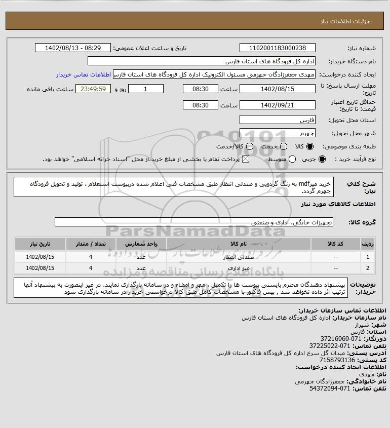 استعلام خرید میزmdf به رنگ گردویی و صندلی انتظار طبق مشخصات فنی اعلام شده درپیوست استعلام ، تولید و تحویل فرودگاه جهرم گردد., استعلام خرید میزmdf به رنگ گردویی و صندلی انتظار طبق مشخصات فنی اعلام شده درپیوست استعلام ، تولید و تحویل فرودگاه جهرم گردد.