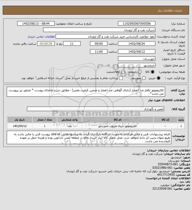 شرح کلی نیاز: الکتروموتور تکفاز ضد انفجار (دارای گواهی ضد انفجار و تضمین کیفیت معتبر) - مطابق شرح تقاضای پیوست