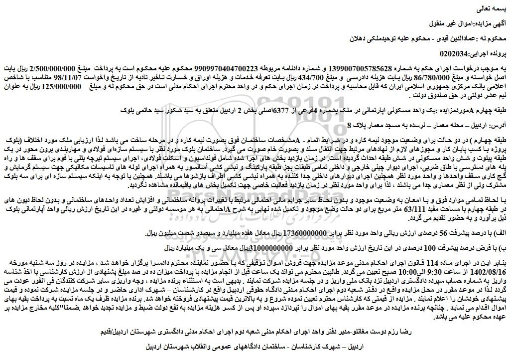 موردمزایده :یک واحد مسکونی اپارتمانی در ملک بشماره 4فرعی از 6377اصلی بخش 2 اردبیل متعلق به سید شکور سید حاتمی بلوک A طبقه چهارم