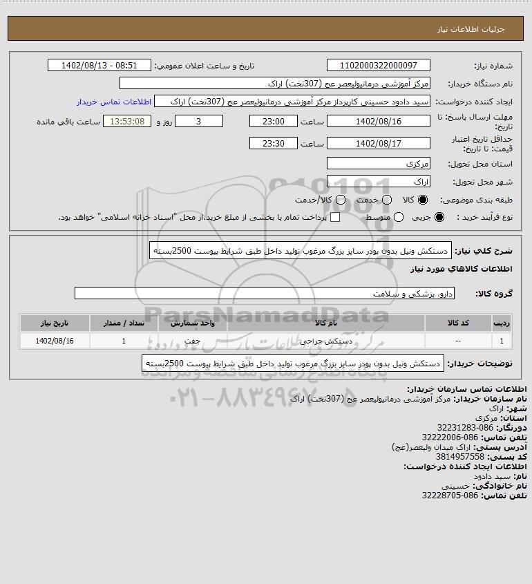 شرح کلی نیاز: دستکش ونیل بدون پودر سایز بزرگ مرغوب تولید داخل طبق شرایط پیوست 2500بسته