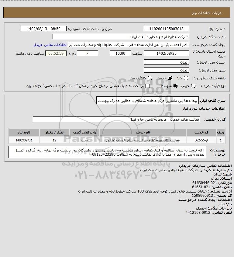 شرح کلی نیاز: پیمان غذایی مامورین مرکز منطقه شمالغرب مطابق مدارک پیوست