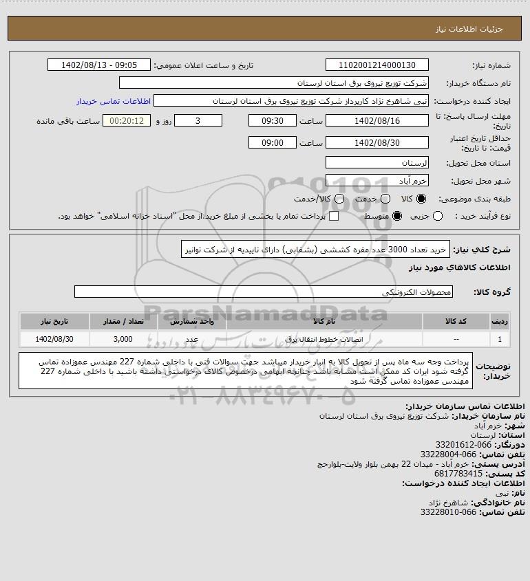 شرح کلی نیاز: خرید تعداد 3000 عدد مقره کششی (بشقابی) دارای تاییدیه از شرکت توانیر