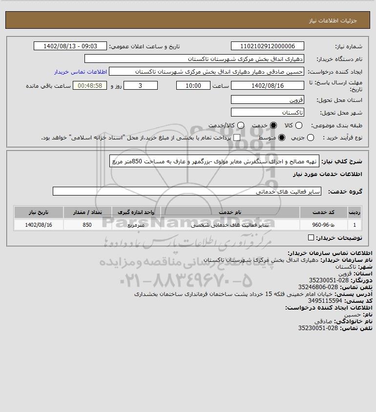 شرح کلی نیاز: تهیه مصالح و اجرای سنگفرش معابر مولوی -بزرگمهر و عارف به مساحت 850متر مربع