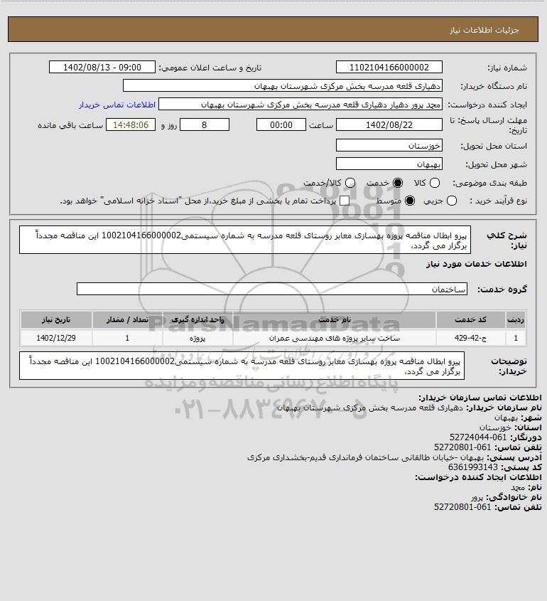 توضیحات خریدار:پیرو ابطال مناقصه پروژه بهسازی معابر روستای قلعه مدرسه به شماره سیستمی1002104166000002 این مناقصه مجدداً برگزار می گردد،