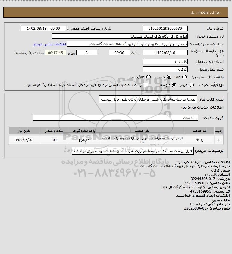 شرح کلی نیاز: بهسازی ساختمان یگان پلیس فرودگاه گرگان طبق فایل پیوست