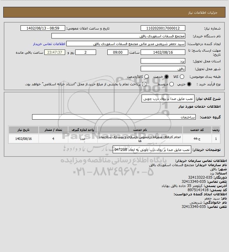 استعلام بها و موضوع استعلام استعلام نصب عایق صدا بر روی درب چوبی به اطلاع کلیه شرکتها و افراد متخصص واجد شرایط میرساند، آگهی گذار در نظر دارد از طریق استعلام بها، نسبت به انتخاب و دریافت پیشنهادات اقدام نماید. این استعلام با کد آگهی ثبت شده در سامانه خبرگزاری پارس نماد : 6576118 منتشر شده است. مشخصات استعلام : تاریخ شروع استعلام: 1402/08/13 آخرین مهلت ارسال پیشنهاد قیمت : 1402/08/16 و محل اجرای پروژه : استان یزد میباشد. استعلام قیمت مورد درخواست : استعلام نصب عایق صدا بر روی درب چوبی با دستهبندیهای تخصصی و گروه های مرتبط : انواع در و پنجره, انواع عایق های رطوبتی ،حرارتی ،صوتی, مصنوعات چوبی و مبلمان اداری, ساختمان, استعلام اطلاع رسانی میگردد.