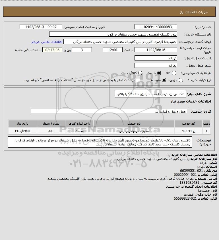 شرح کلی نیاز: تاکسی زرد ترجیحا سمند یا پژو مدل 95 یا بالاتر.