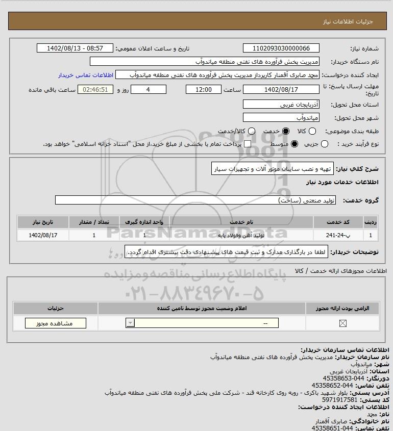 شرح کلی نیاز: ﺗﻬﯿﻪ و ﻧﺼﺐ ﺳﺎﯾﺒﺎن ﻣﻮﺗﻮر آﻻت و ﺗﺠﻬﯿﺰات ﺳﯿﺎر