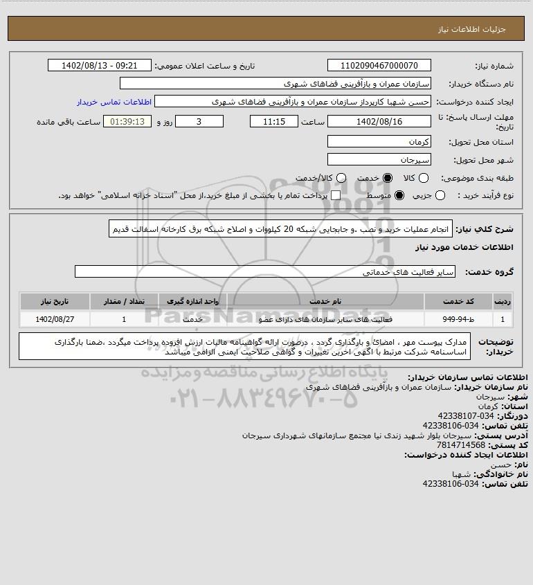 شرح کلی نیاز: انجام عملیات خرید و نصب .و جابجایی شبکه 20 کیلووات و اصلاح شبکه برق کارخانه اسفالت قدیم