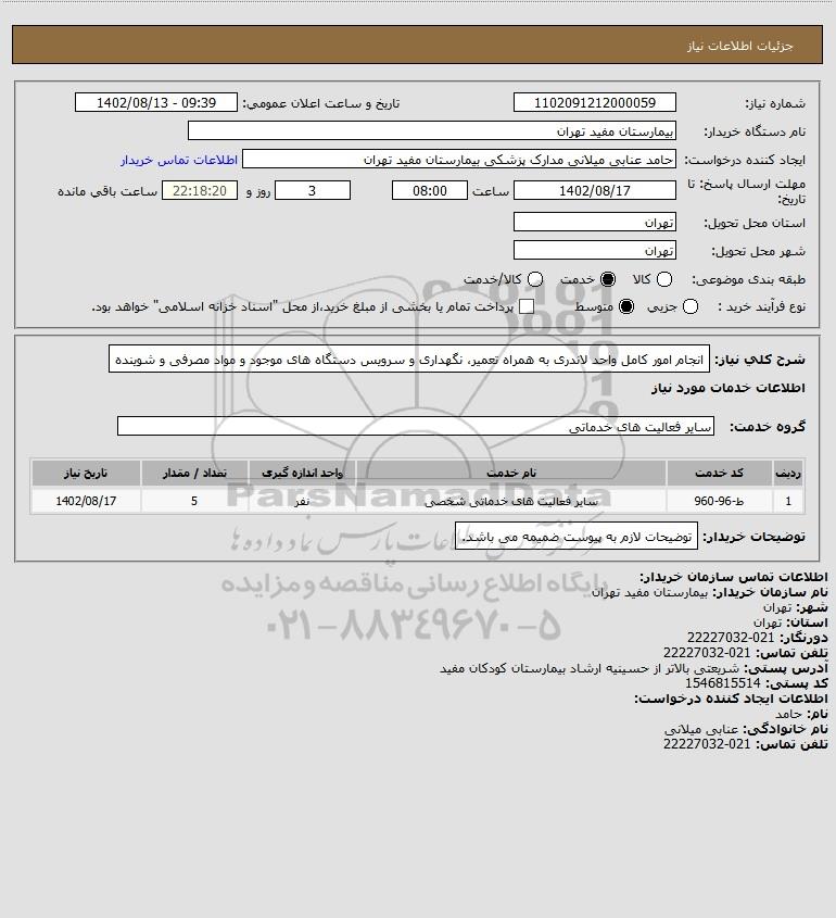 شرح کلی نیاز: انجام امور کامل واحد لاندری به همراه تعمیر، نگهداری و سرویس دستگاه های موجود و مواد مصرفی و شوینده