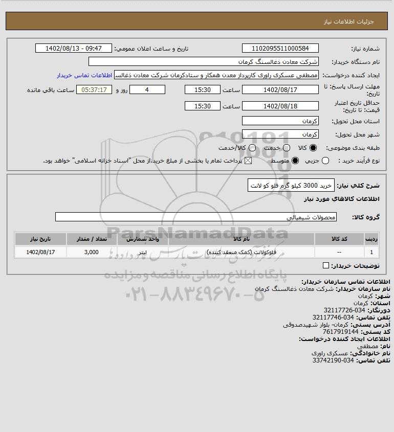شرح کلی نیاز: خرید 3000 کیلو گرم فلو کو لانت