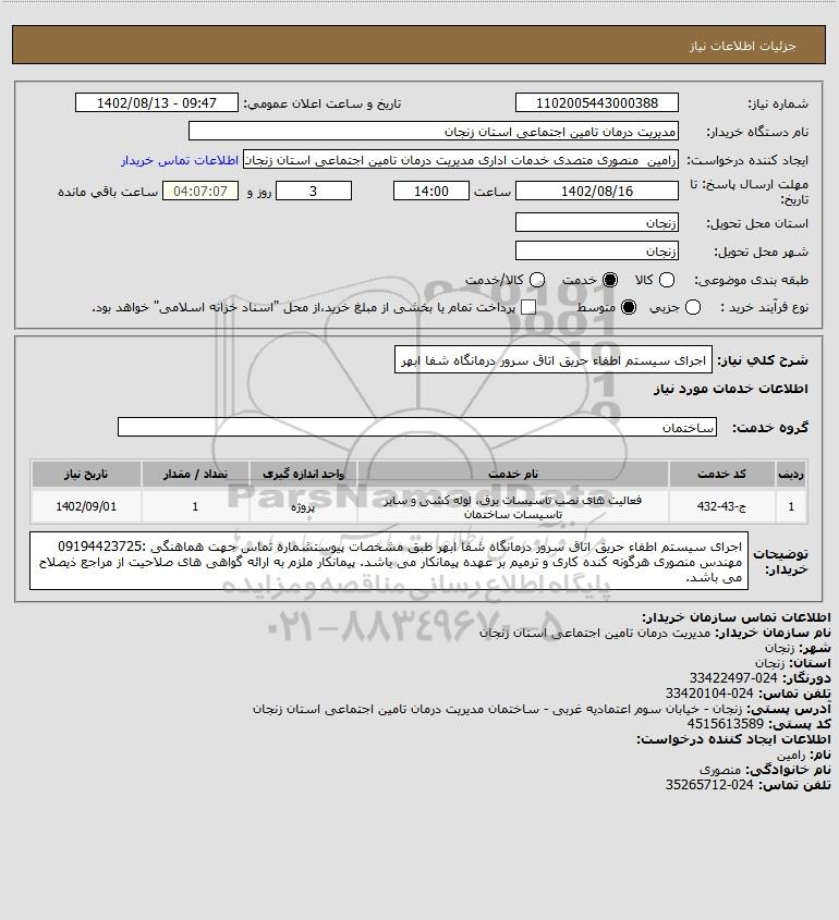 شرح کلی نیاز: اجرای سیستم اطفاء حریق اتاق سرور درمانگاه شفا ابهر