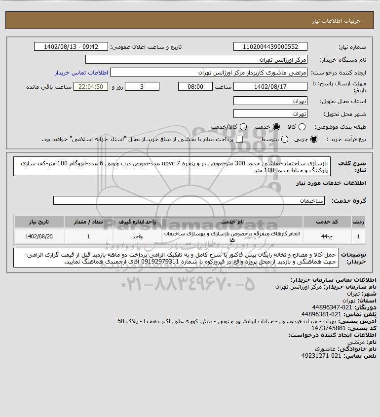 شرح کلی نیاز: بازسازی ساختمان-نقاشی حدود 300 متر-تعویض در و پنجره upvc 7 عدد-تعویض درب چوبی 6 عدد-ایزوگام 100 متر-کف سازی پارکینگ و حیاط حدود 100 متر