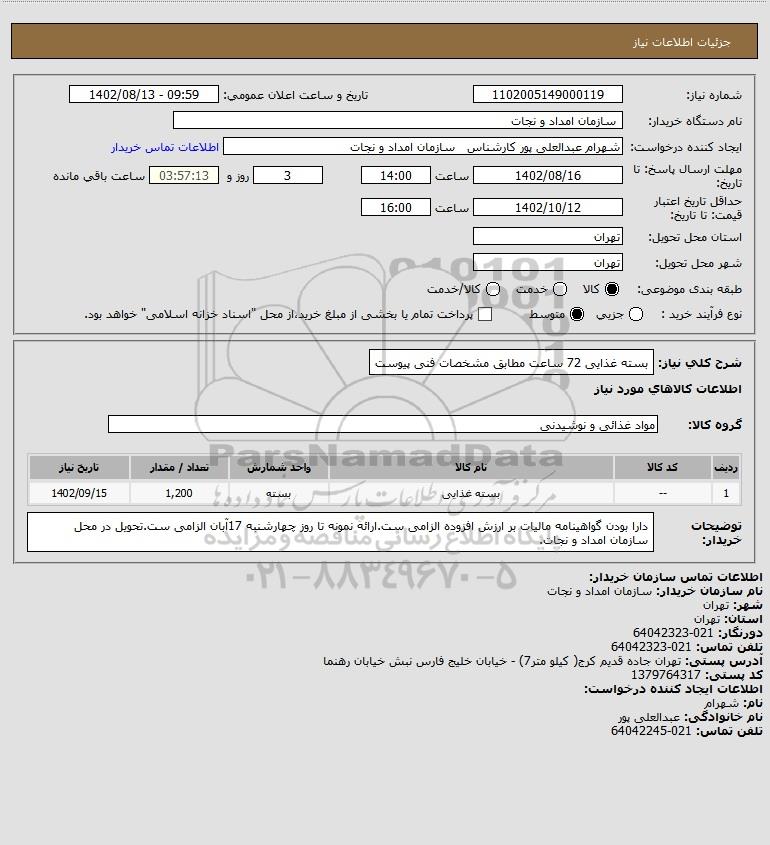شرح کلی نیاز: بسته غذایی 72 ساعت مطابق مشخصات فنی پیوست