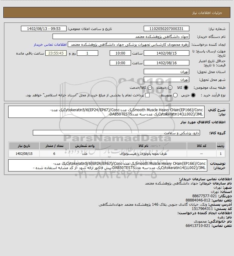 استعلام بها و موضوع استعلام استعلام Smooth Muscle Heavy CHain(EP166)/Concیک عدد-Cytokeratin5/6(EP24/EP67)/Concیک عدد-Cytokeratin14(LL002)/3MLیک عدد-سه عددDAB50TESTS- به اطلاع کلیه شرکتها و افراد متخصص واجد شرایط میرساند، آگهی گذار در نظر دارد از طریق استعلام بها، نسبت به انتخاب و دریافت پیشنهادات اقدام نماید. این استعلام با کد آگهی ثبت شده در سامانه خبرگزاری پارس نماد : 6576716 منتشر شده است. مشخصات استعلام : تاریخ شروع استعلام: 1402/08/13 آخرین مهلت ارسال پیشنهاد قیمت : 1402/08/15 و محل اجرای پروژه : استان تهران میباشد. استعلام قیمت مورد درخواست : استعلام Smooth Muscle Heavy CHain(EP166)/Concیک عدد-Cytokeratin5/6(EP24/EP67)/Concیک عدد-Cytokeratin14(LL002)/3MLیک عدد-سه عددDAB50TESTS- با دستهبندیهای تخصصی و گروه های مرتبط : خدمات و تجهیزات آزمایشگاهی و پزشکی, استعلام اطلاع رسانی میگردد.