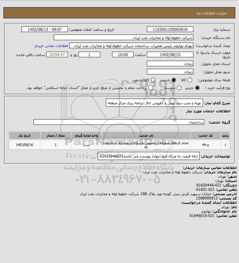 شرح کلی نیاز: تهیه و نصب دیوار پوش و کفپوش اتاق برنامه ریزی مرکز منطقه