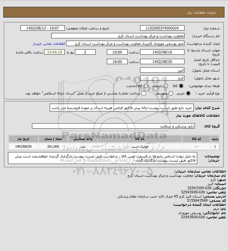 | 1 | -- | فولیک اسید | عدد | 201,000 | 1402/08/20 |