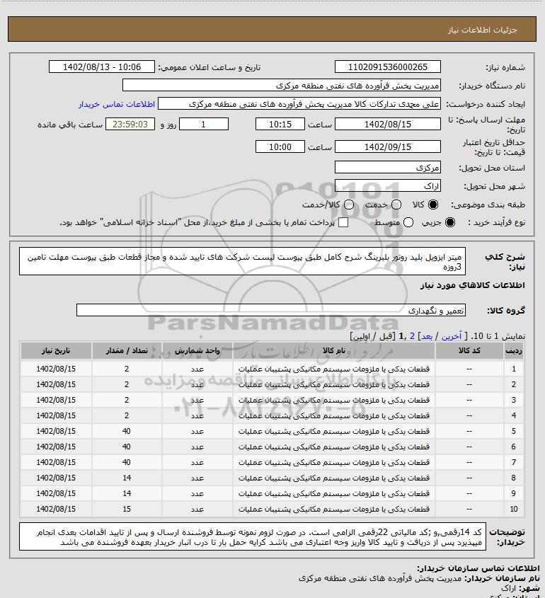 | 10 | -- | قطعات یدکی یا ملزومات سیستم مکانیکی پشتیبان عملیات | عدد | 15 | 1402/08/15 |