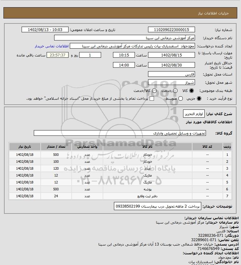 استعلام بها و موضوع استعلام استعلام لوازم التحریر به اطلاع کلیه شرکتها و افراد متخصص واجد شرایط میرساند، آگهی گذار در نظر دارد از طریق استعلام بها، نسبت به انتخاب و دریافت پیشنهادات اقدام نماید. این استعلام با کد آگهی ثبت شده در سامانه خبرگزاری پارس نماد : 6576973 منتشر شده است. مشخصات استعلام : تاریخ شروع استعلام: 1402/08/13 آخرین مهلت ارسال پیشنهاد قیمت : 1402/08/15 و محل اجرای پروژه : استان فارس میباشد. استعلام قیمت مورد درخواست : استعلام لوازم التحریر با دستهبندیهای تخصصی و گروه های مرتبط : نوشت افزار, استعلام اطلاع رسانی میگردد.