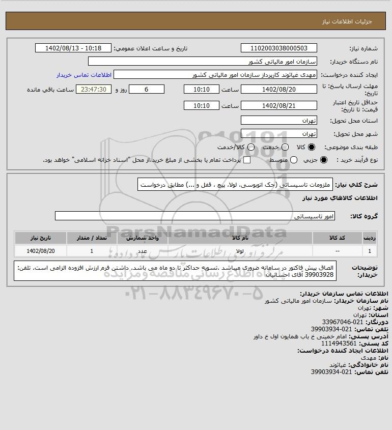 شرح کلی نیاز: ملزومات تاسیساتی (جک اتوبوسی، لولا، پیچ ، قفل و ...) مطابق درخواست