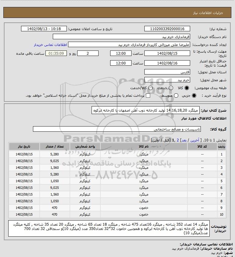 استعلام میلگرد 14,16,18,20 تولید کارخانه ذوب آهن اصفهان یا کارخانه ابرکوه, استعلام میلگرد 14,16,18,20 تولید کارخانه ذوب آهن اصفهان یا کارخانه ابرکوه