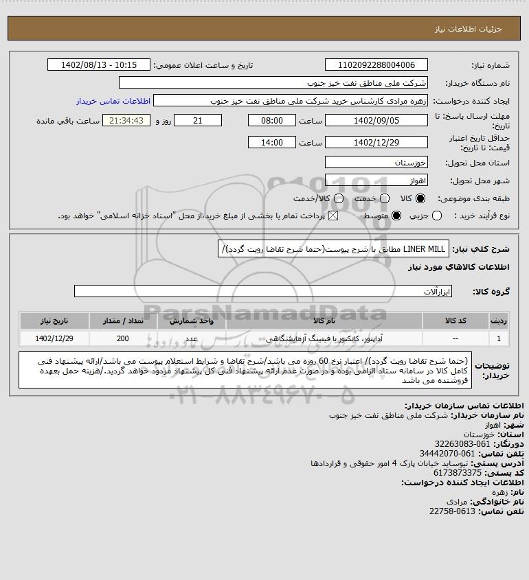 استعلام LINER MILL مطابق با شرح پیوست(حتما شرح تقاضا رویت گردد)/, استعلام LINER MILL مطابق با شرح پیوست(حتما شرح تقاضا رویت گردد)/
