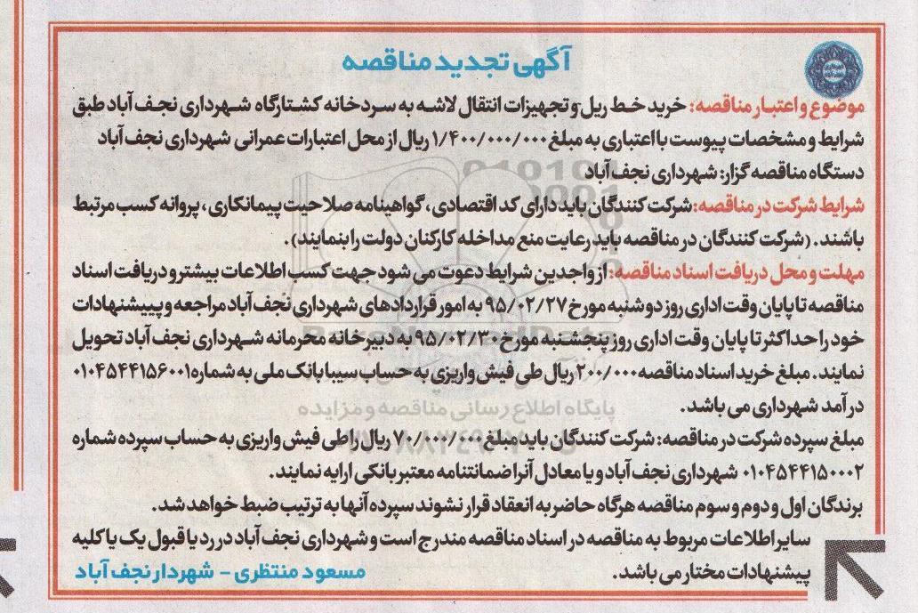 موضوع و اعتبار مناقصه: خرید خط ریل و تجهیزات انتقال لاشه به سردخانه کشتارگاه شهرداری نجف آباد طبق شرایط و مشخصات پیوست با اعتباری به مبلغ 1.400.000.000 ریال از محل اعتبارات عمرانی سال 94 شهرداری نجف آباد