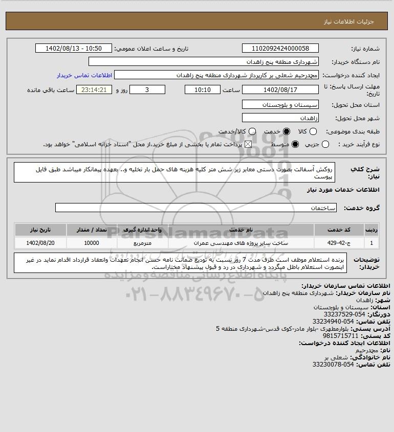 نام دستگاه خریدار:شهرداری منطقه پنج زاهدان