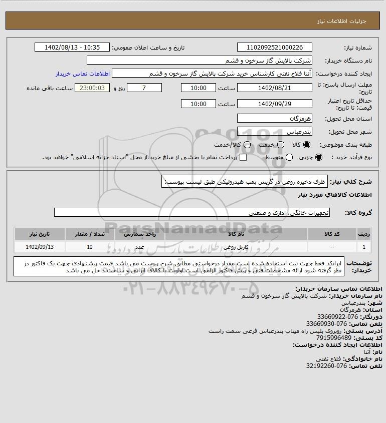استعلام ظرف ذخیره روغن در گریس پمپ هیدرولیکی طبق لیست پیوست:, استعلام ظرف ذخیره روغن در گریس پمپ هیدرولیکی طبق لیست پیوست: