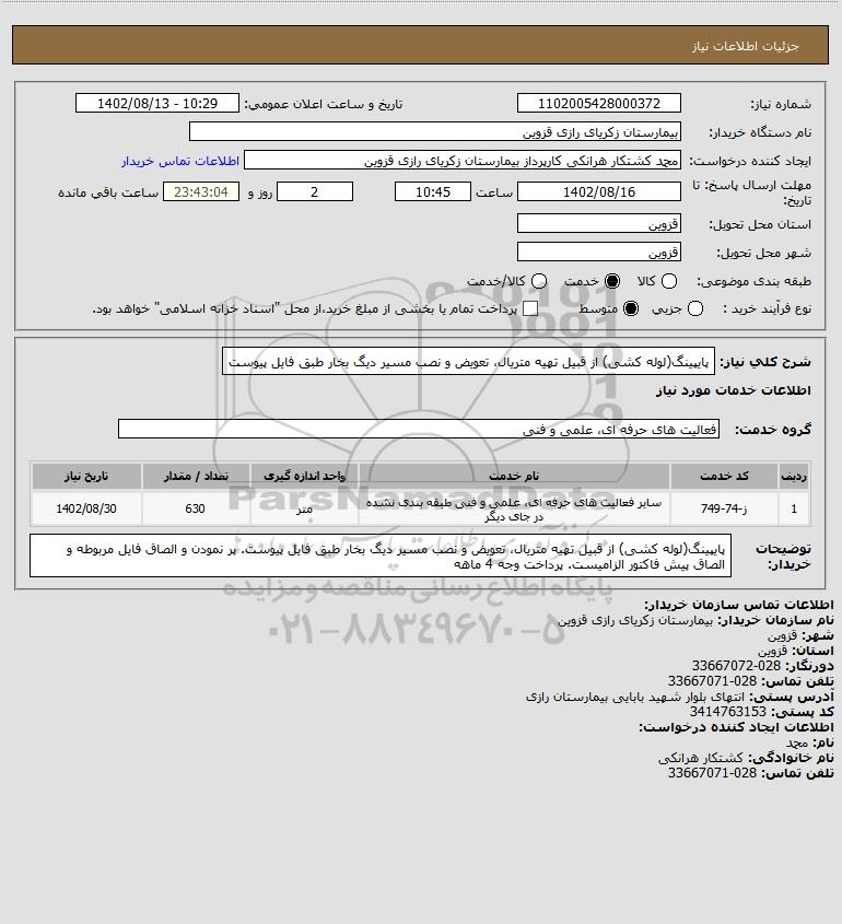 استعلام پایپینگ(لوله کشی) از قبیل تهیه متریال، تعویض و نصب مسیر دیگ بخار طبق فایل پیوست, استعلام پایپینگ(لوله کشی) از قبیل تهیه متریال، تعویض و نصب مسیر دیگ بخار طبق فایل پیوست