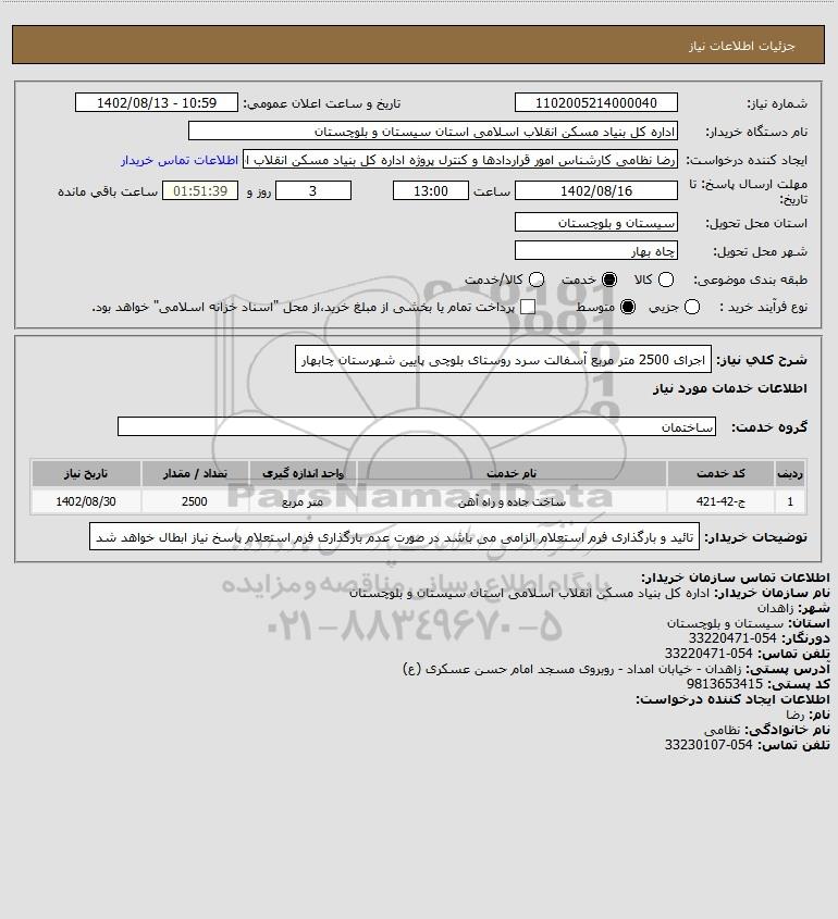 شرح کلی نیاز: اجرای 2500 متر مربع آسفالت سرد روستای بلوچی پایین شهرستان چابهار