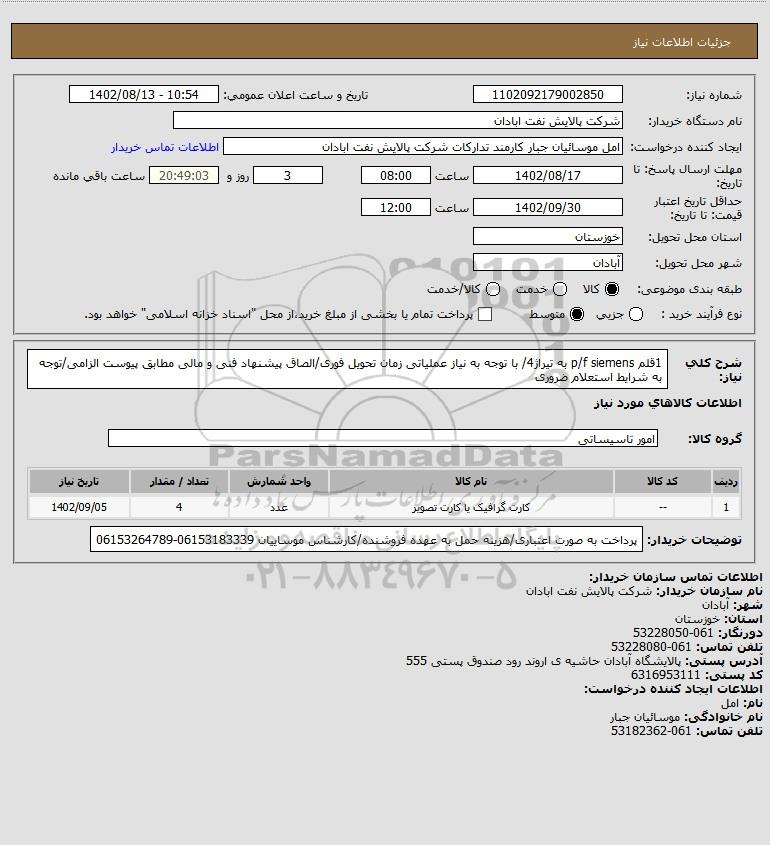 شرح کلی نیاز: 1قلم p/f siemens به تیراژ4/ با توجه به نیاز عملیاتی زمان تحویل فوری/الصاق پیشنهاد فنی و مالی مطابق پیوست الزامی/توجه به شرایط استعلام ضروری