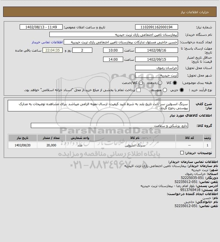 | 1 | -- | سرنگ انسولین | عدد | 20,000 | 1402/08/20 |