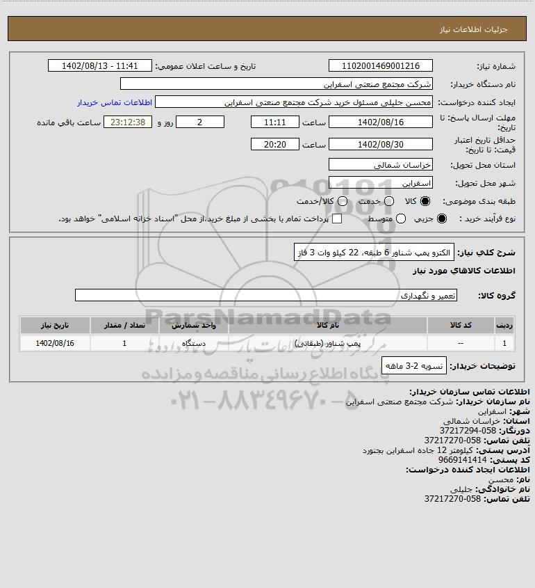 شرح کلی نیاز: الکترو پمپ شناور 6 طبقه، 22 کیلو وات 3 فاز