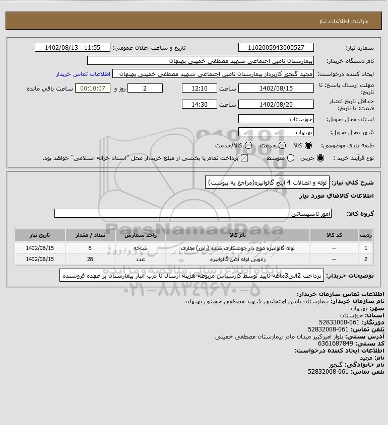 | 2 | -- | زانویی لوله آهن گالوانیزه | عدد | 28 | 1402/08/15 |