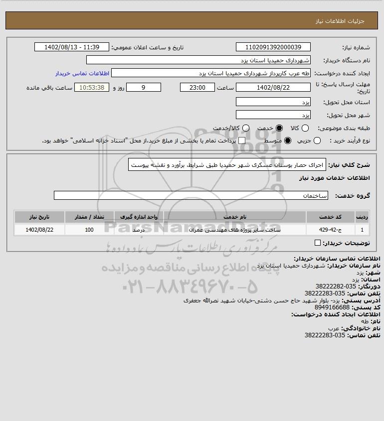 شرح کلی نیاز: اجرای حصار بوستان عسکری شهر حمیدیا طبق شرایط، برآورد و نقشه پیوست