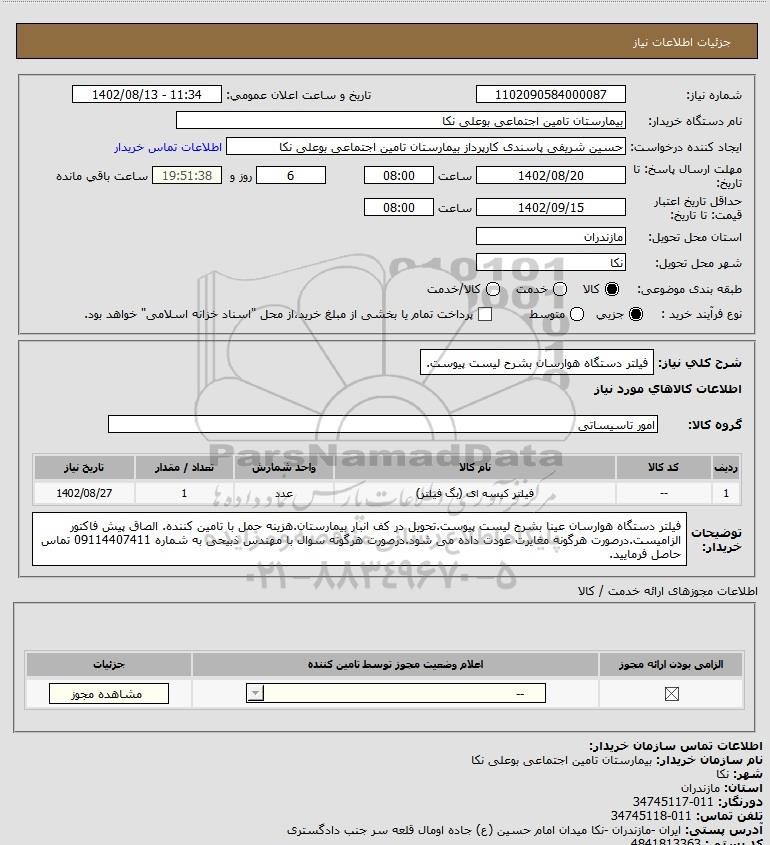شرح کلی نیاز: فیلتر دستگاه هوارسان بشرح لیست پیوست.
