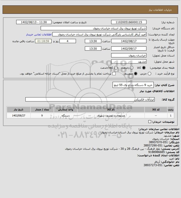 شرح کلی نیاز: خرید 9 دستگاه ویدئو وال 55 اینچ