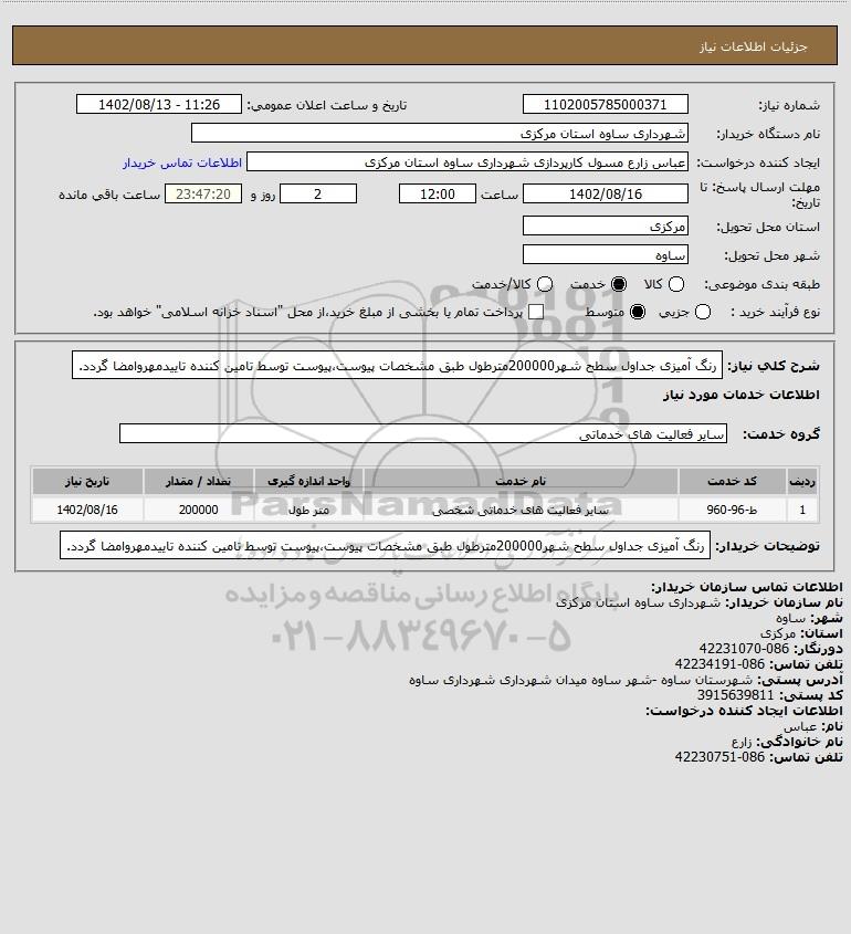 توضیحات خریدار:رنگ آمیزی جداول سطح شهر200000مترطول طبق مشخصات پیوست،پیوست توسط تامین کننده تاییدمهروامضا گردد.