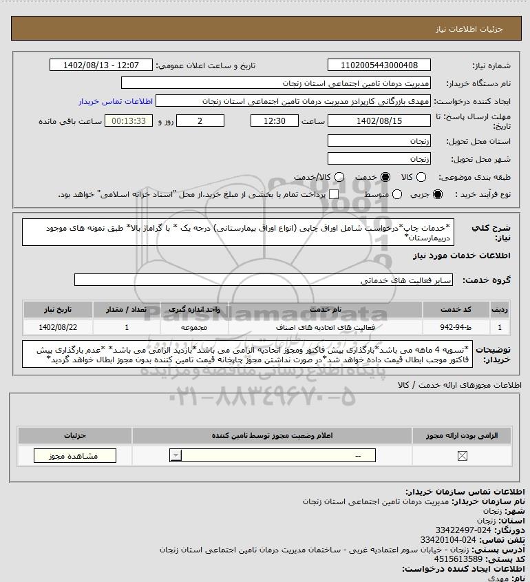 نام دستگاه خریدار:مدیریت درمان تامین اجتماعی استان زنجان