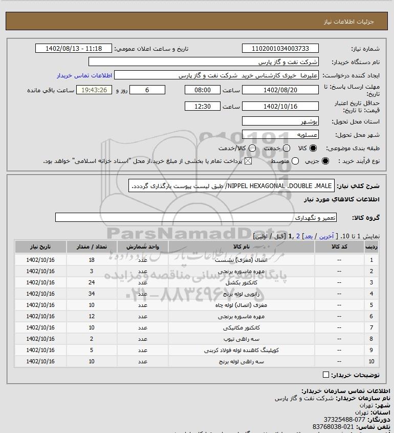 استعلام NIPPEL HEXAGONAL .DOUBLE .MALE/ طبق لیست پیوست بارگذاری گرددد., استعلام NIPPEL HEXAGONAL .DOUBLE .MALE/ طبق لیست پیوست بارگذاری گرددد.