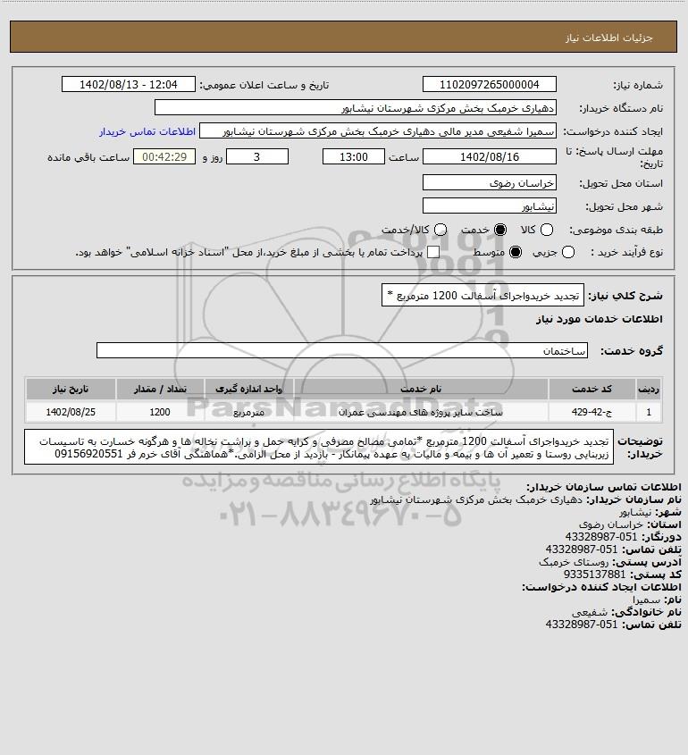 شرح کلی نیاز: تجدید خریدواجرای آسفالت 1200 مترمربع *