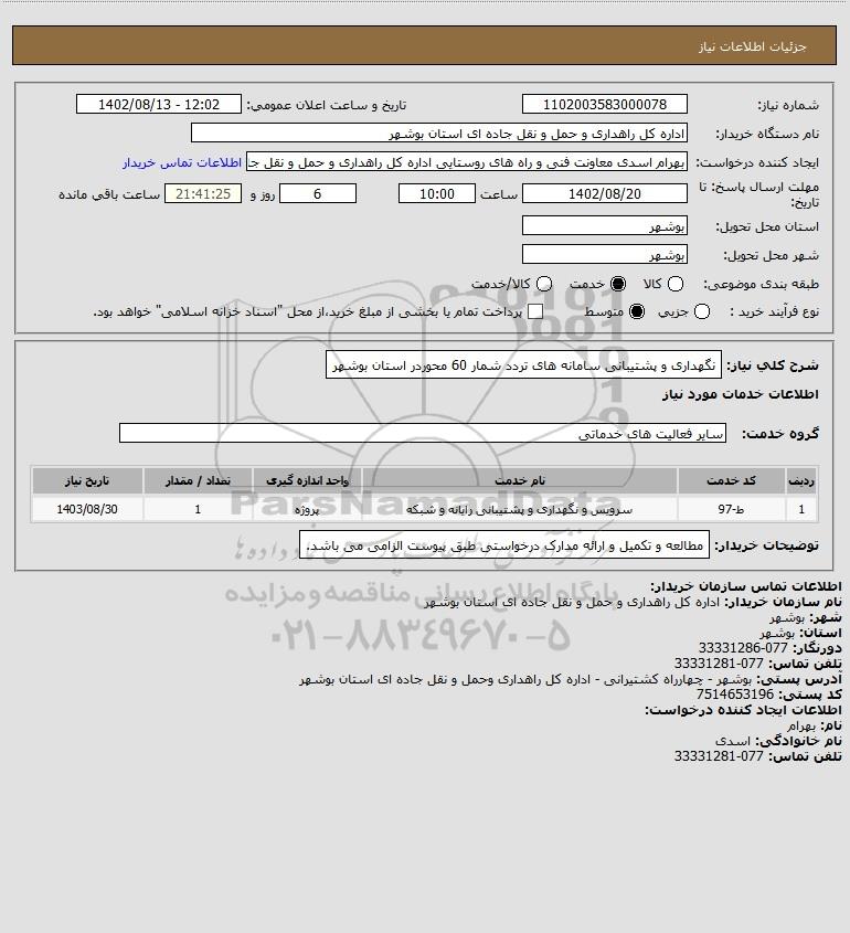 شرح کلی نیاز: نگهداری و پشتیبانی سامانه های تردد شمار 60 محوردر استان بوشهر