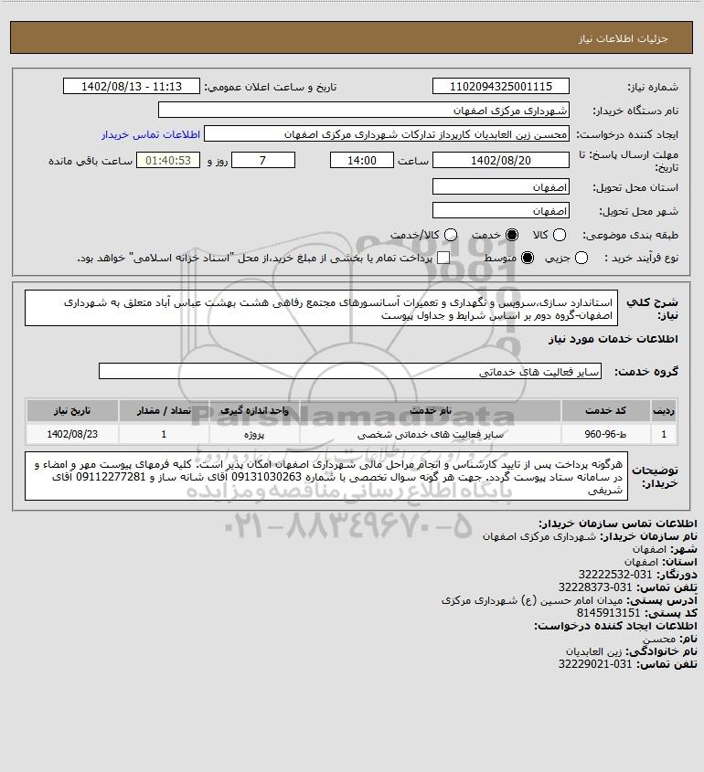 شرح کلی نیاز: استاندارد سازی،سرویس و نگهداری و تعمیرات آسانسورهای مجتمع رفاهی هشت بهشت عباس آباد متعلق به شهرداری اصفهان-گروه دوم بر اساس شرایط و جداول پیوست