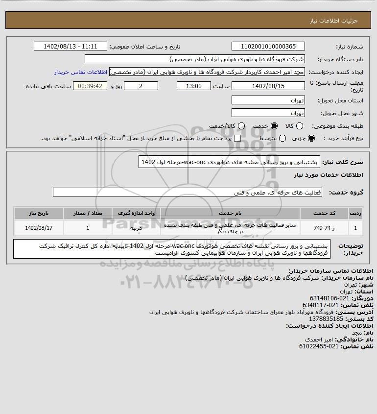 شرح کلی نیاز: پشتیبانی و بروز رسانی نقشه های هوانوردی wac-onc-مرحله اول 1402