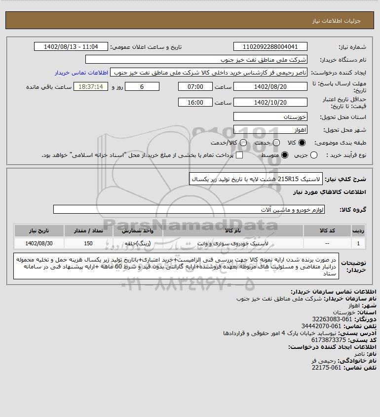 شرح کلی نیاز: لاستیک 215R15 هشت لایه با تاریخ تولید زیر یکسال