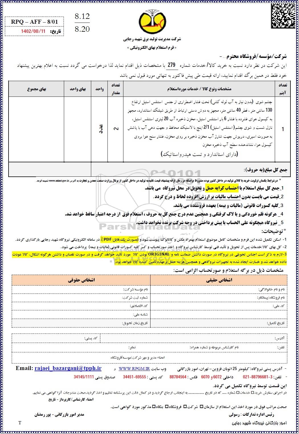این شرکت در نظر دارد نسبت به خرید کالا/ خدمات شماره 279 با مشخصات ذیل اقدام نماید. لذا درخواست می گردد نسبت به اعلام بهترین پیشنهاد خود فقط در همین برگ اقدام نمایید، ارائه قیمت طی پیش فاکتور به تنهائی مورد قبول نمی باشد.